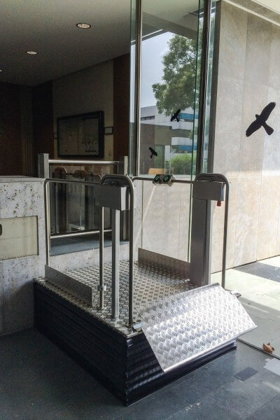 Dank des sehr flachen Scherenhubsystems und zuverlässiger Spindel-Antriebstechnik wird die Rollstuhl-Hebebühne direkt auf dem planierten Boden installiert. Der Einstieg erfolgt über eine Rampe, die gleichzeitig als Abrollschutz dient. Der geringe Höhenunterschied von lediglich 55 Millimeter wird durch ein Versenken der Plattform zusätzlich minimiert.